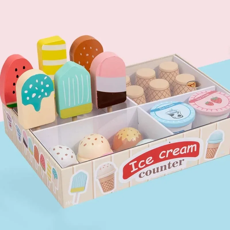 【Lead-free & Safe to Use】: This ice cream play set with non-toxic water paint is made of 100% solid wood and the edges of each part is well-rounded without any burrs. Complying with all international toy safety standards, the wooden ice cream set is safe for babies.