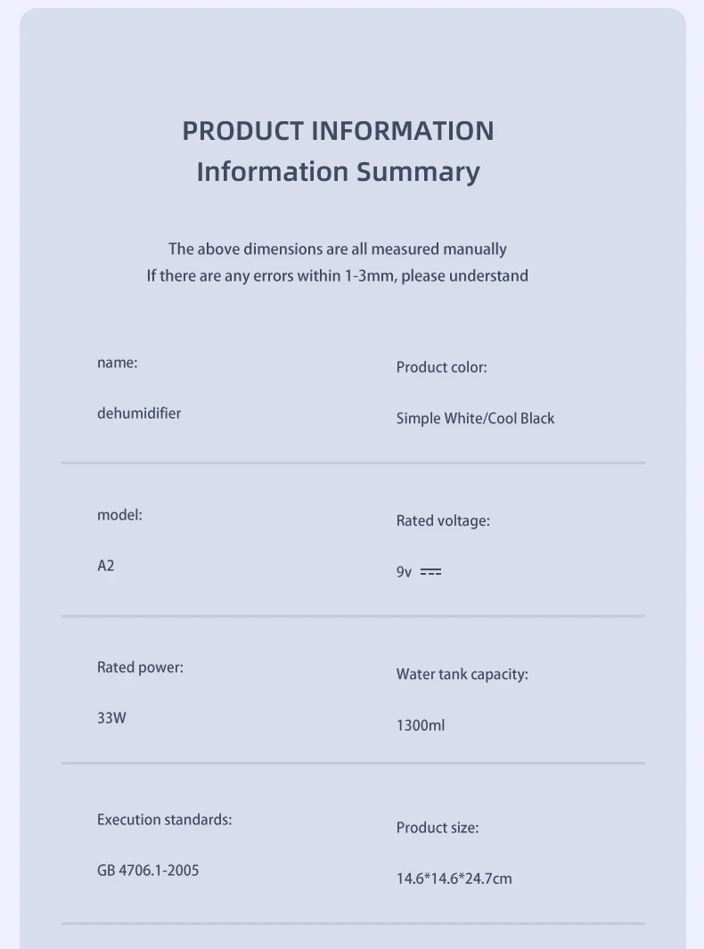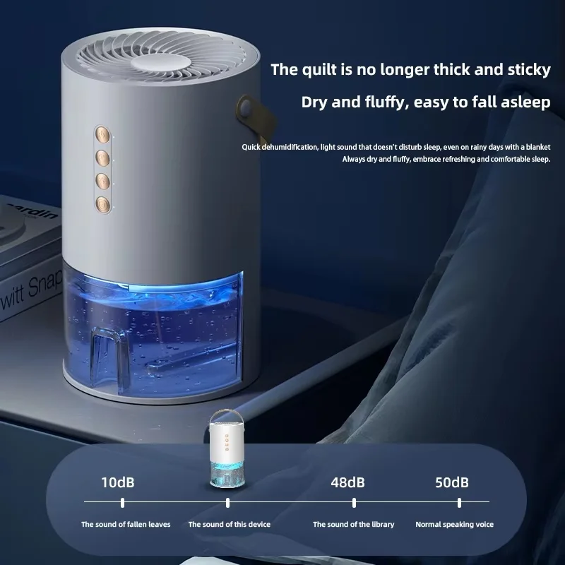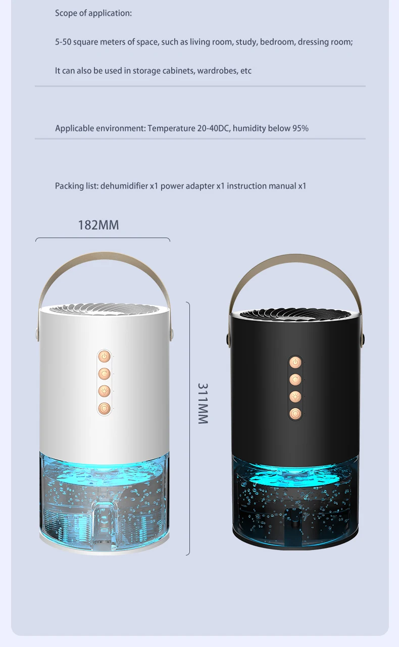 The visual water tank monitors the water absorption at any time, and dehumidifies for 3-4 days in an environment with 85% air humidity. The water level sensing system is equipped with a light indicator on the right side of the power button when the water is full, and it automatically stops working, making it safer to use.