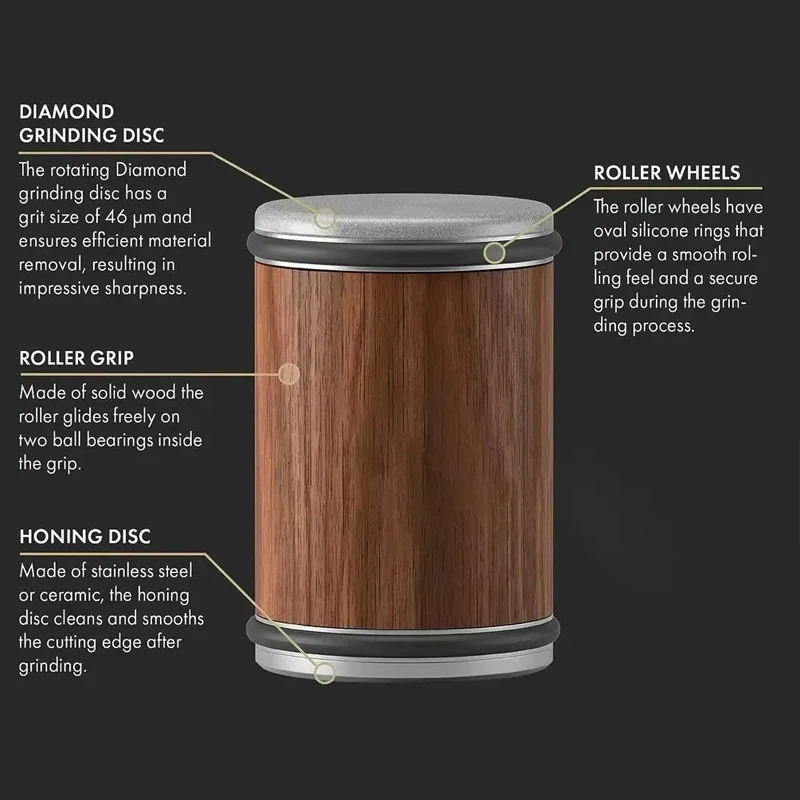 【SLIM & STYLISH DESIGN】- With a 15° angle for a fine cutting edge and a 20° angle for a sturdy blade, our rolling knife sharpener features a beautiful design. Simply press lightly on the roller and everyone can quickly sharpen their knives like a professional. It not only increases functionality, but also adds a touch of elegance to your kitchen.